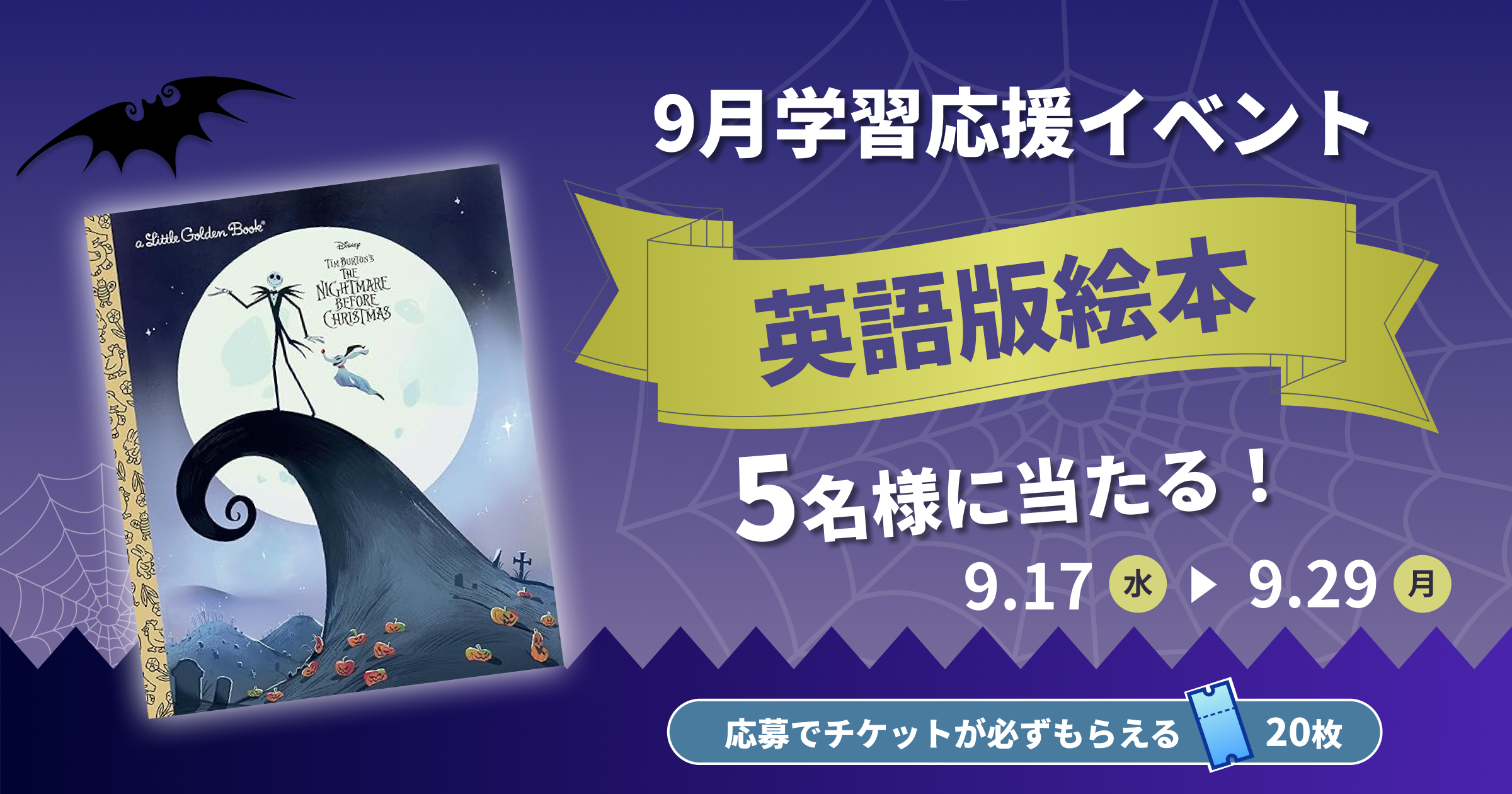 9月は、[ショート版]『ナイトメアー・ビフォア・クリスマス』(ジャック)を含む全8作品の中から、お好きな物語で「リスニング」と「スピーキング」を学習して、プレゼントを当てよう!