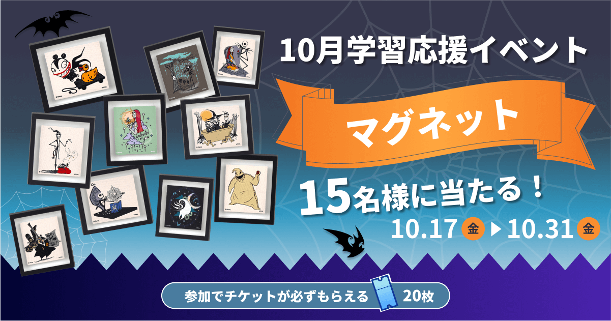 [ショート版]『ナイトメアー・ビフォア・クリスマス』(サリー)を含む全9作の中から、お好きな物語で「リスニング」を学習するとアプリ内チケット、「スピーキング」を学習するとマグネットが当たるチャンス!