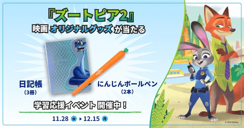 11月は、[ショート版]『ズートピア』を含む全11作の中から、お好きな物語で「リスニング」を学習すると『ズートピア』スマホ壁紙、「スピーキング」を学習すると12月5日(金)公開ディズニー映画最新作『ズートピア2』映画オリジナルグッズが当たるイベントを開催!